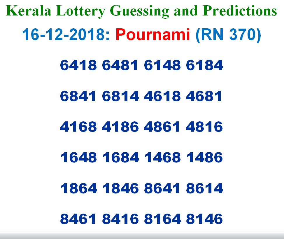 kerala lottery today; Kerala Lottery Result from keralalotteryresult .First prize only 70 lakes Today Kerala bhagyakuri result is Pournami (RN-370) 16-12-2018 weekly lottery draw conducted by Kerala lottery department at gorky bhavan Auditorium using Lottery Machine, live results starting at 3.00 pm.