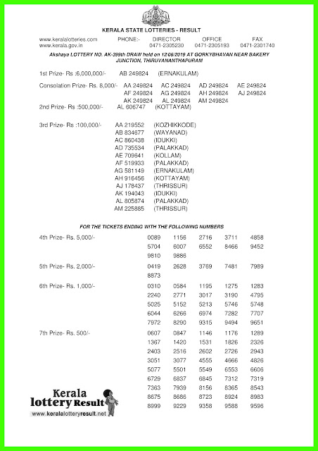Today lottery result Kerala Lottery Result from keralalotteryresult. First prize only 60 lakes Today Kerala bhagyakuri result is Akshaya (AK-399) 12-06-2019 weekly lottery draw conducted by Kerala lottery department at GORKY BHAVAN Auditorium using Lottery Machine, live results starting at 3.00 pm.