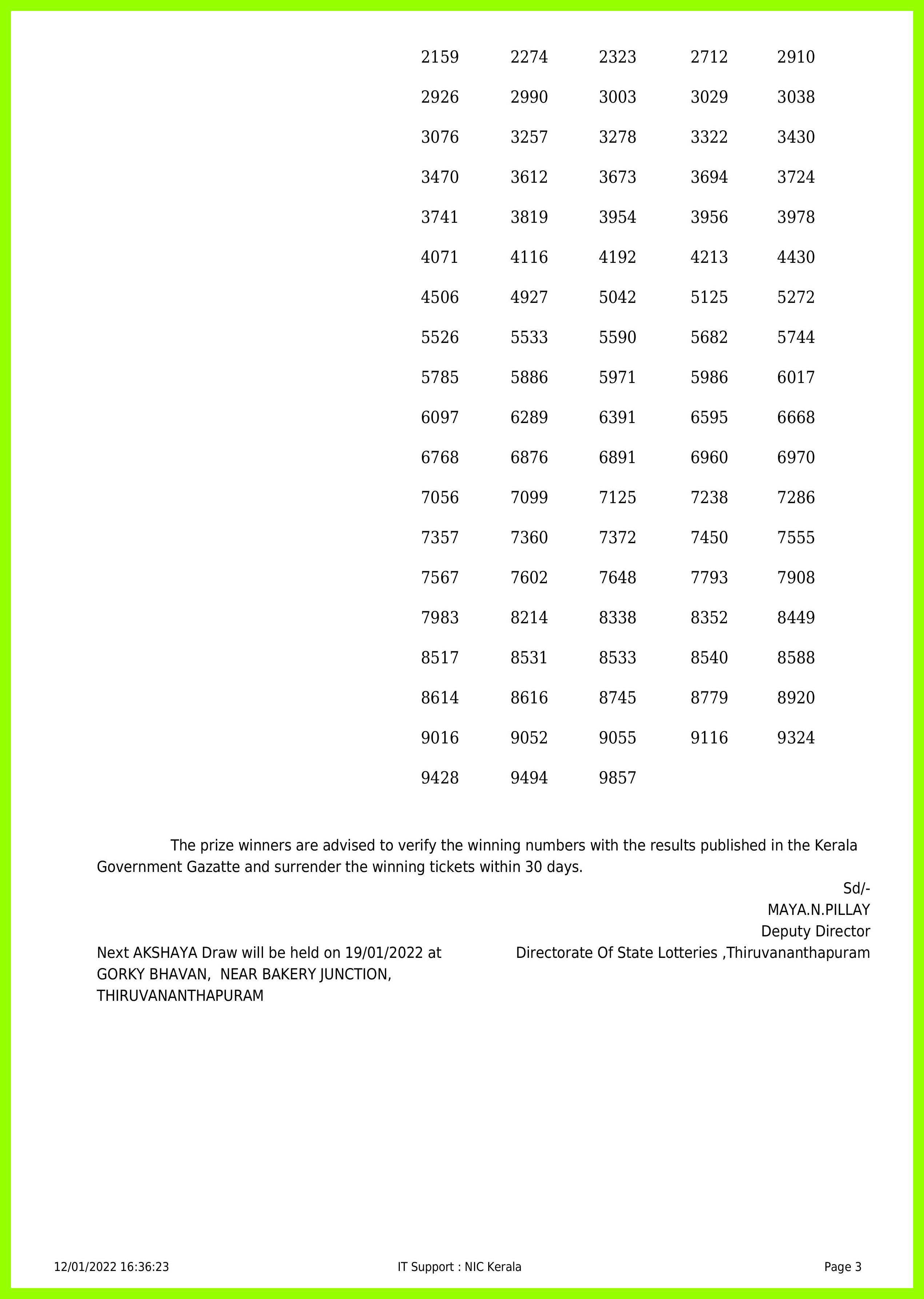 The prize winners are advised to verify the winning numbers with the results published in the Kerala Government Gazette and surrender the winning tickets within 30 days